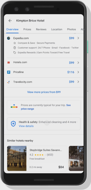 Ao avaliar hotéis em google.com/travel, acesse uma lista e role para baixo até uma nova guia Saúde e segurança (Health & Safety). Lá, você aprenderá mais sobre a resposta do COVID-19 da instalação, incluindo um cronograma de desinfecção rigoroso, proteções na recepção, interrupção do café da manhã gratuito e outras medidas.